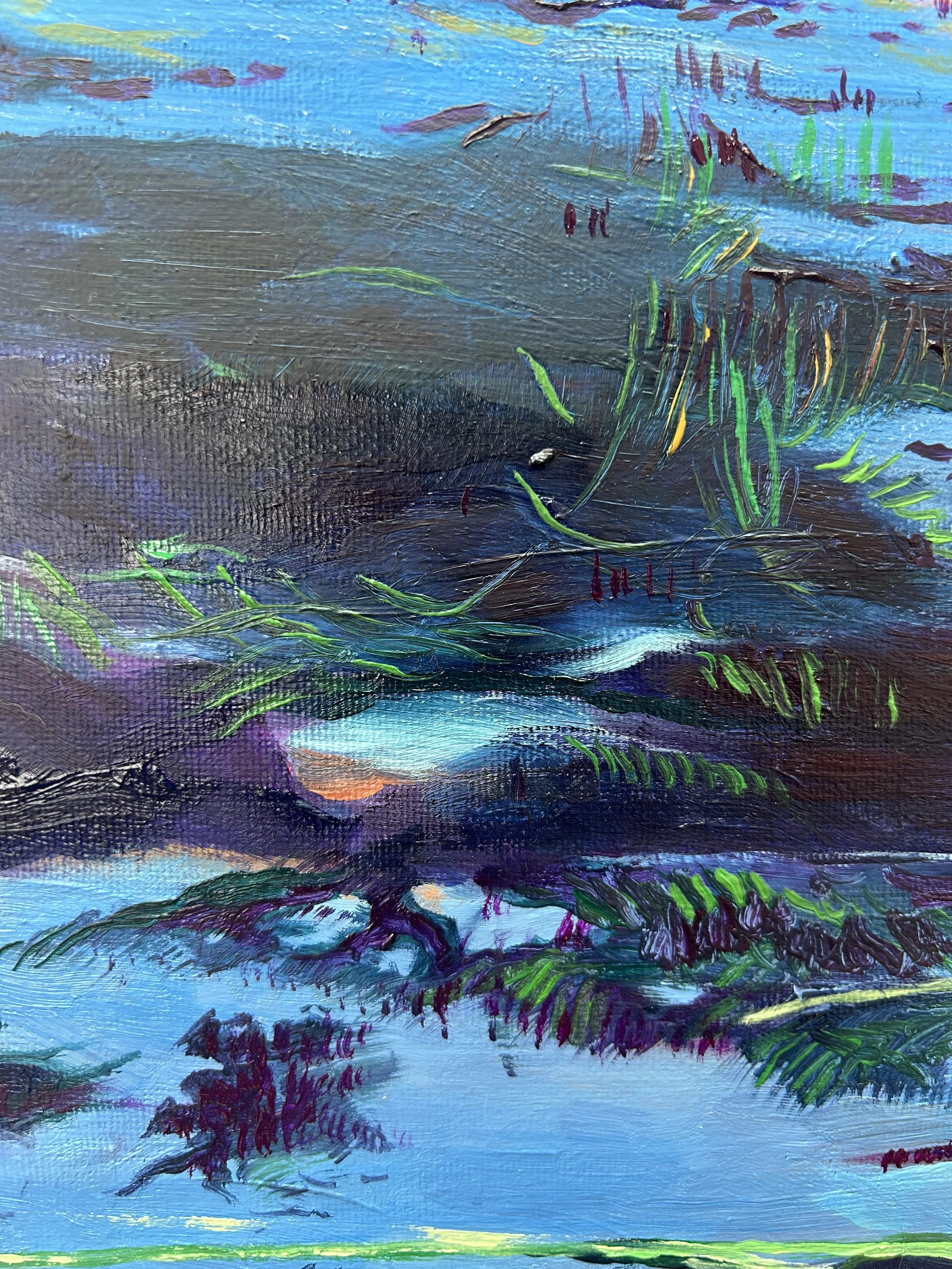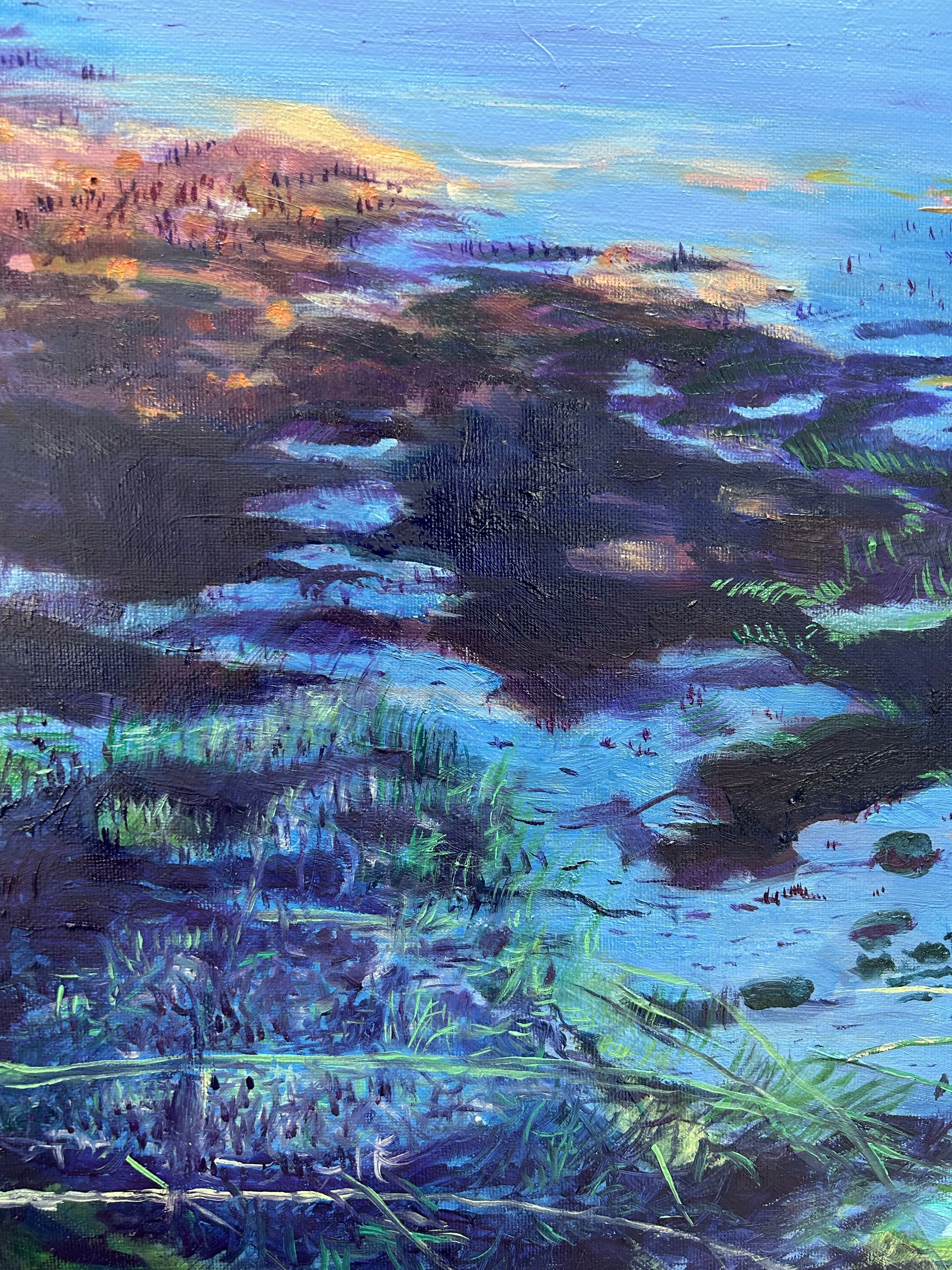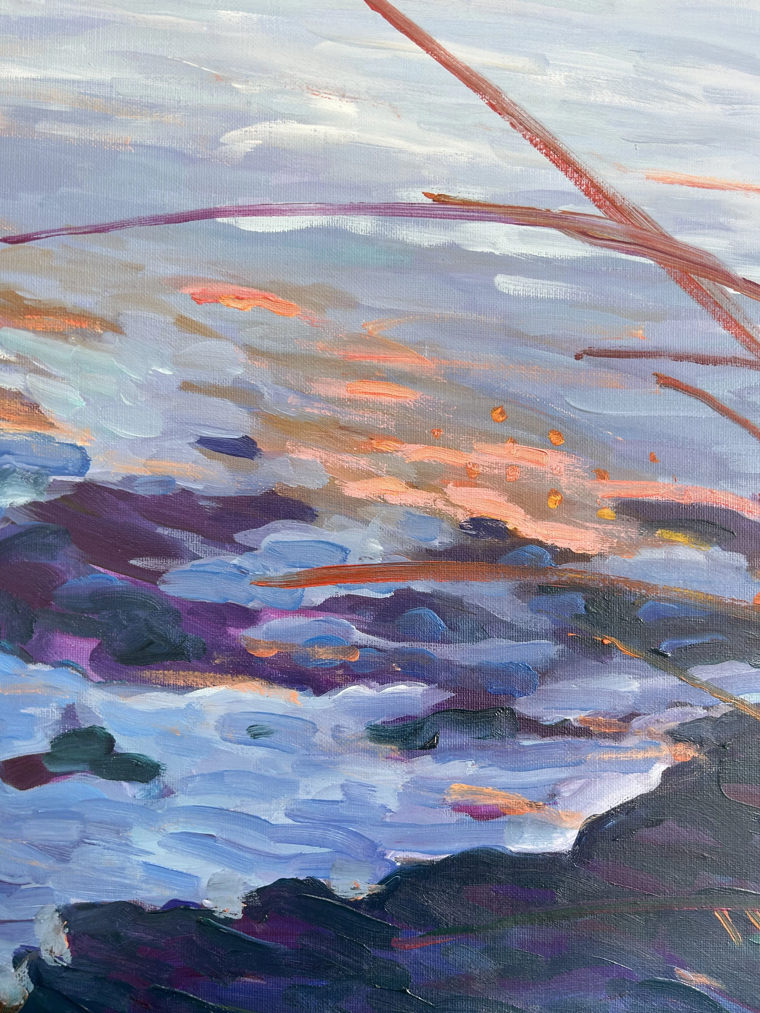 J’ai voulu en garder l’empreinte sur la toile : des bleus profonds qui se mêlent aux violets et aux verts, ponctués d’éclats roses et orangés, comme un souffle de soleil couchant.