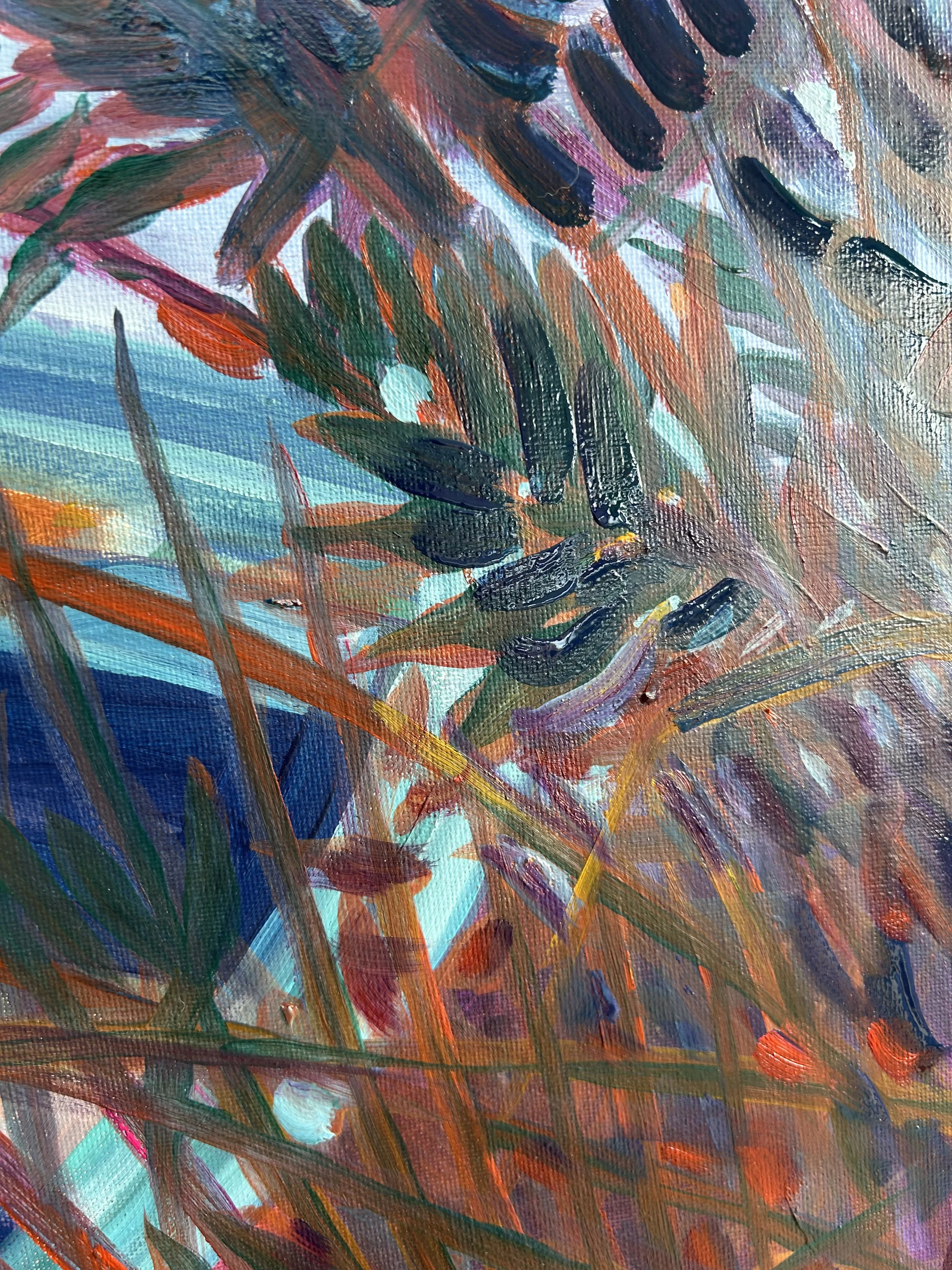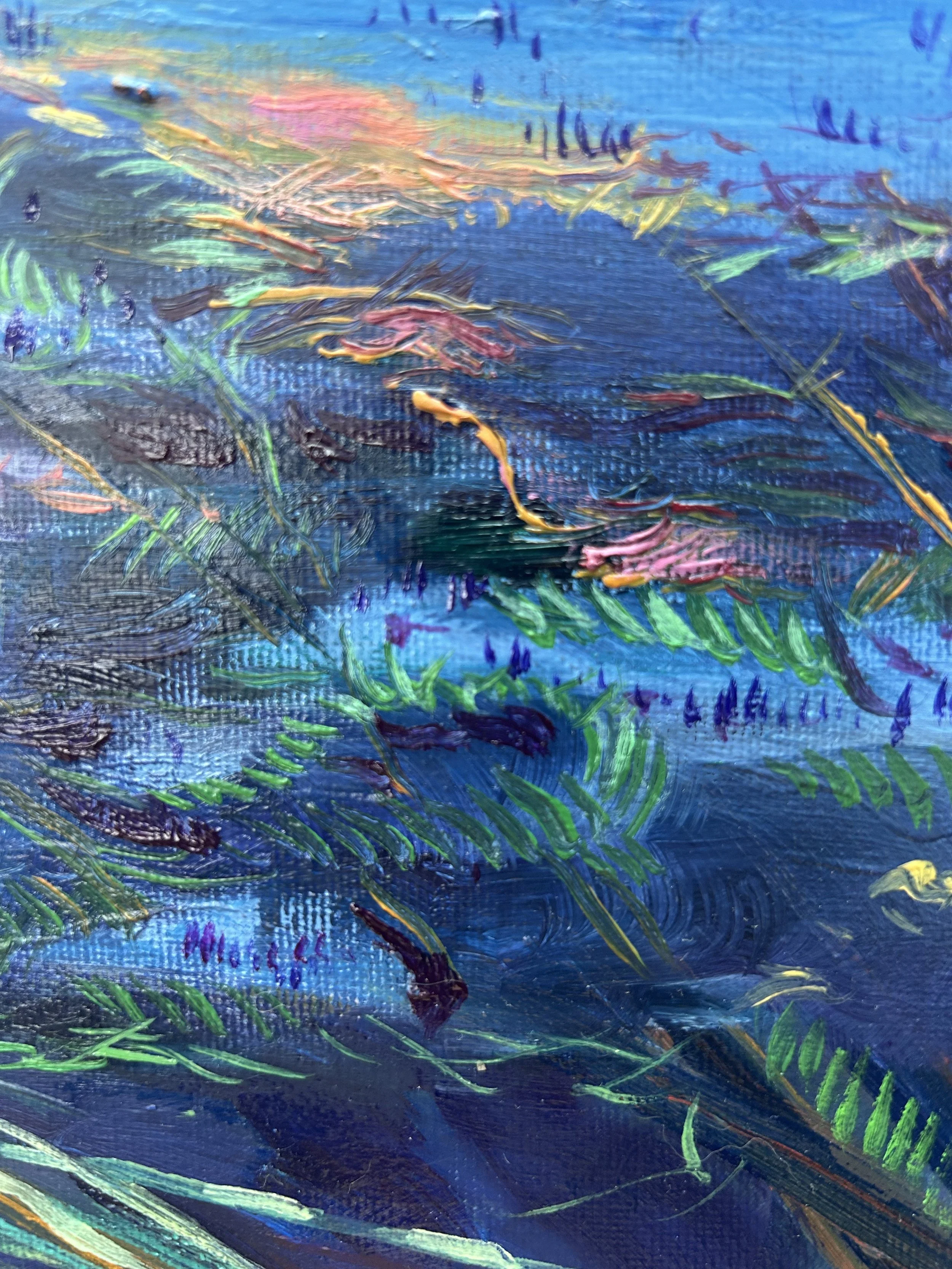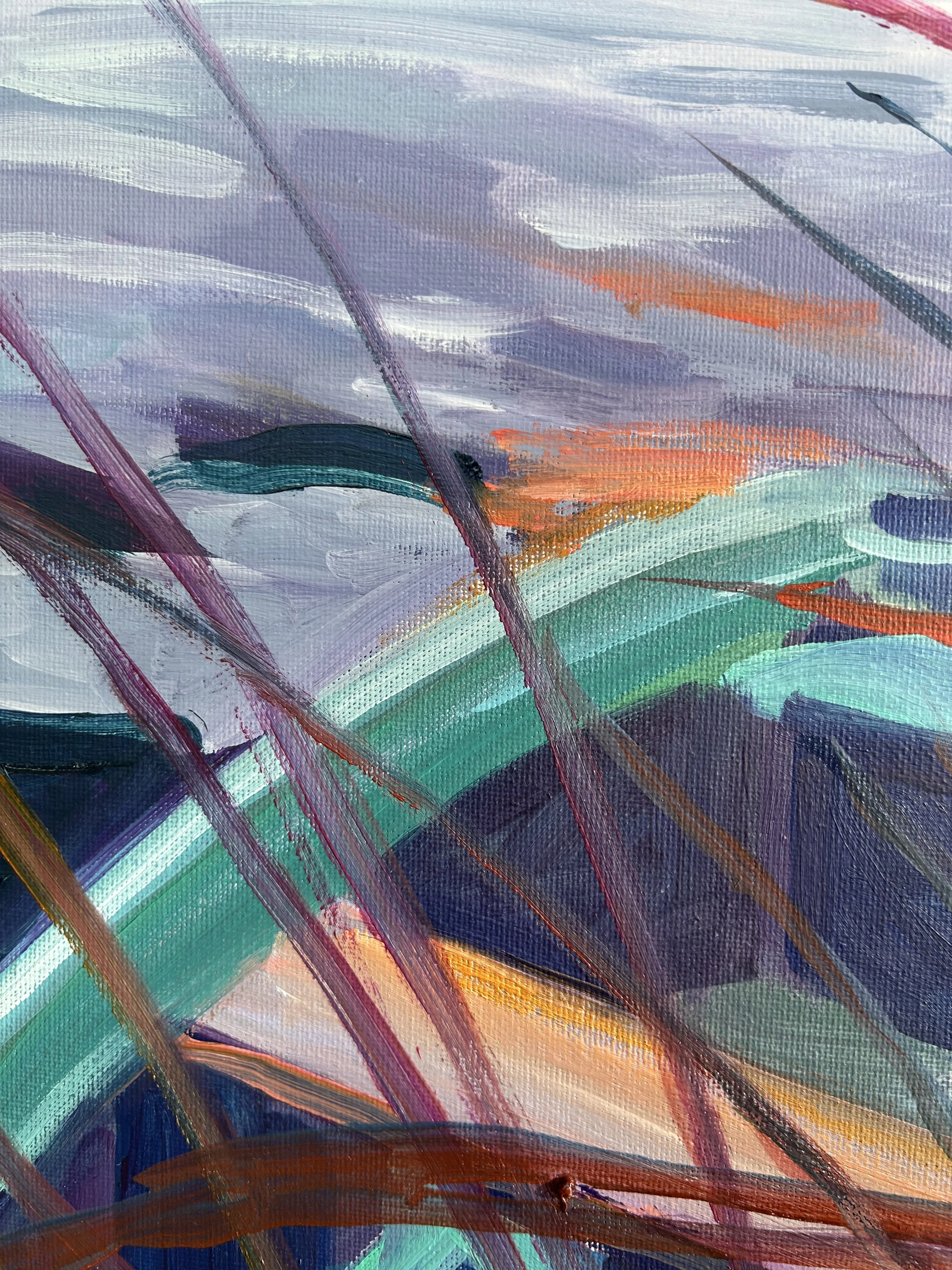 J’ai voulu en garder l’empreinte sur la toile : des bleus profonds qui se mêlent aux violets et aux verts, ponctués d’éclats roses et orangés, comme un souffle de soleil couchant.