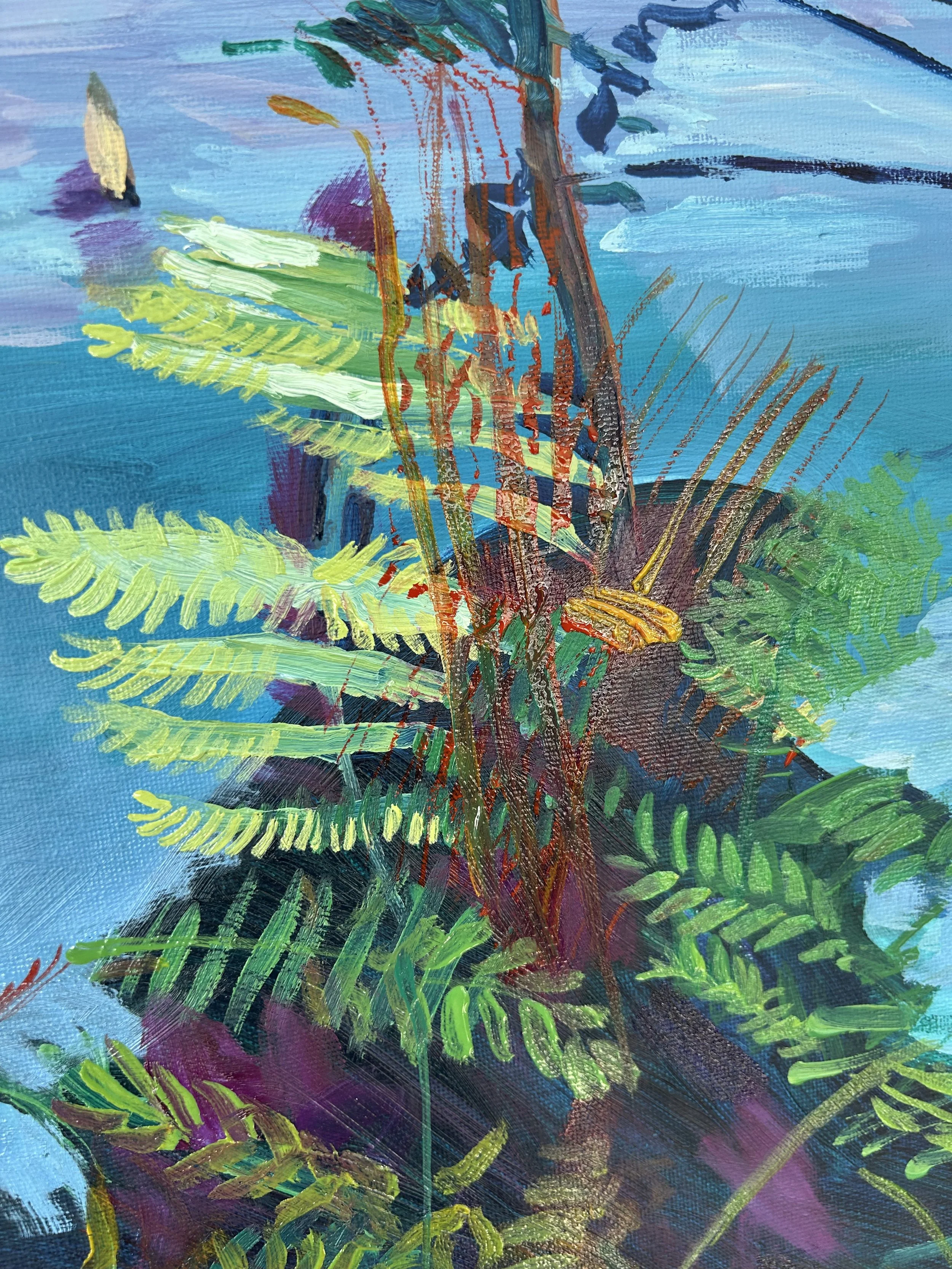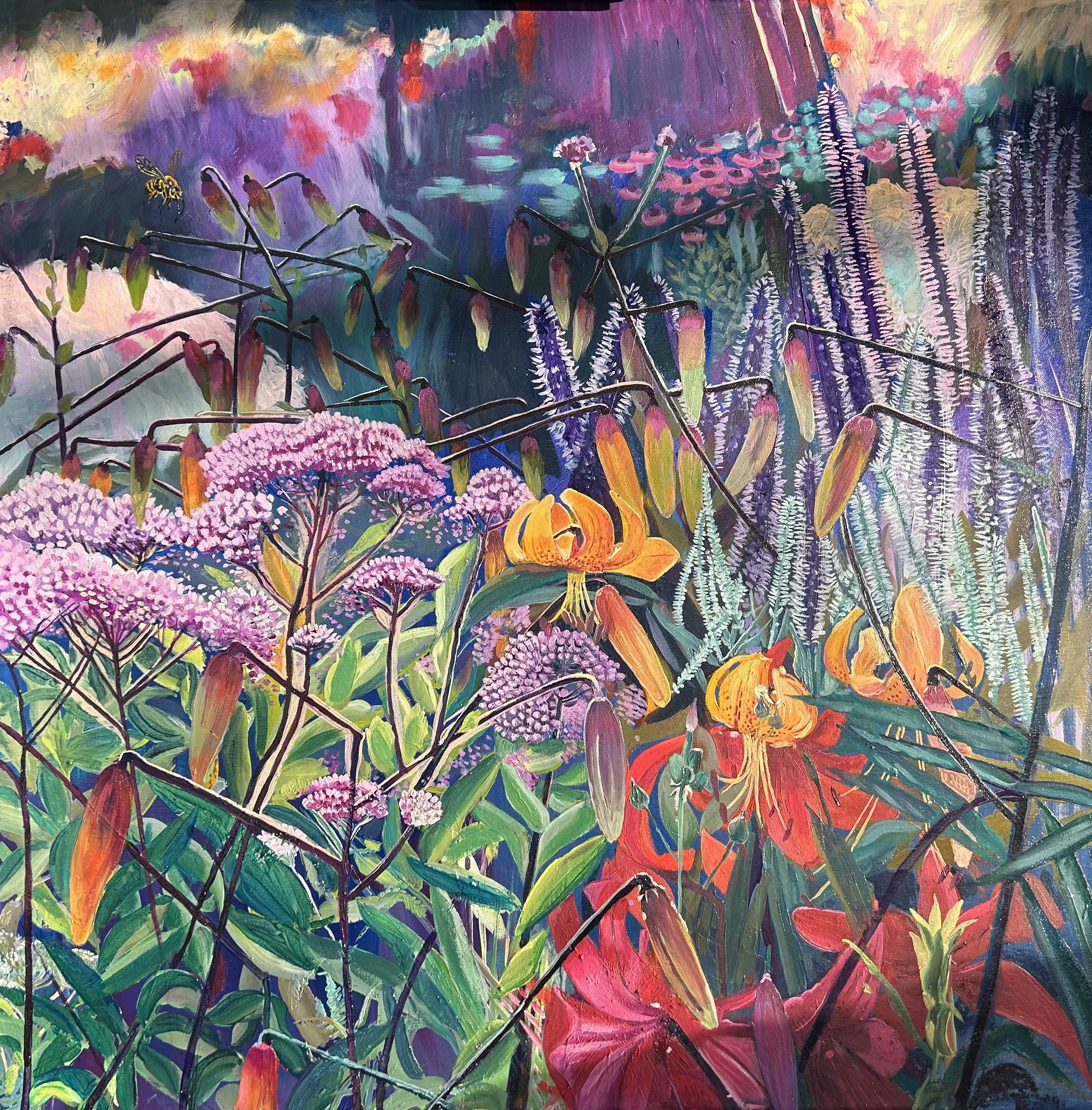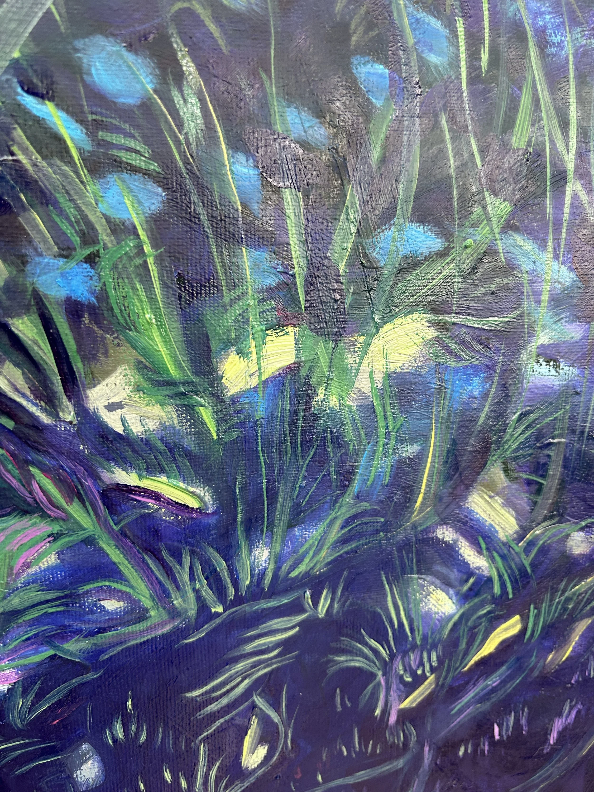 Un tableau en particulier m’a fait basculer : une grande toile que je voulais très détaillée au départ. Mais sur ce grand format, le détail s’est révélé inutile, presque absurde. J’ai tout recouvert, travaillé à nouveau en grand geste, en rythme, en émotion. Et c’est devenu évident : le jardin n’a pas besoin d’être imité. Il peut être évoqué, suggéré, ressenti.